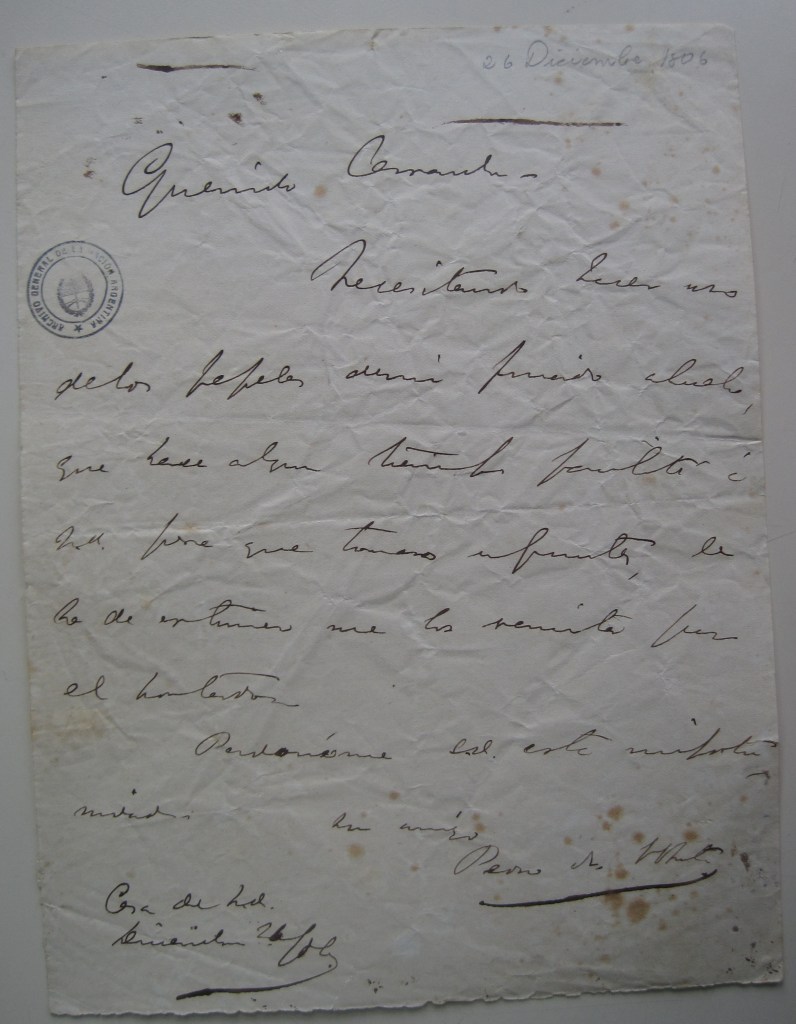 Este es especialmente cierto en el caso del Fondo White. Como lo prueba una nota conservada en el fondo, Carranza había obtenido en préstamo el voluminoso archivo documental de White, de uno de su nietos, Pedro Nagle White (c. 1834-1865). El año en la fecha agregada a lápiz es incorrecto, y tampoco puede ser 1866 porque Nagle había fallecido el 26 de noviembre del año anterior.