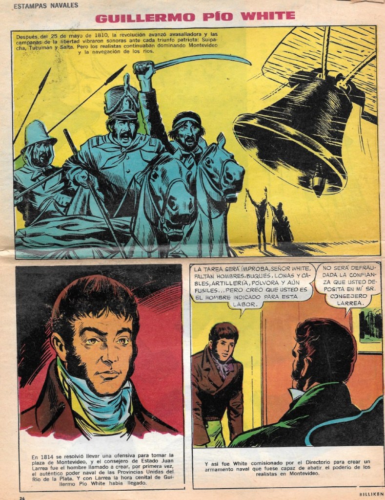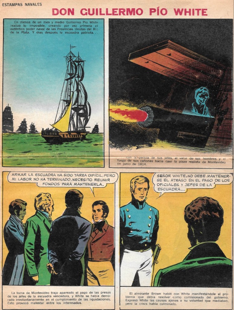 Publicada en dos entregas en la serie Estampas Navales de la famosa revista infantil, el 10 y 17 de enero de 1966, y con el erróneo “Pío” en el título, una narrativa gráfica de su creación de la primera escuadra argentina, en 1814. Es una gentileza de una cuarta nieta suya.