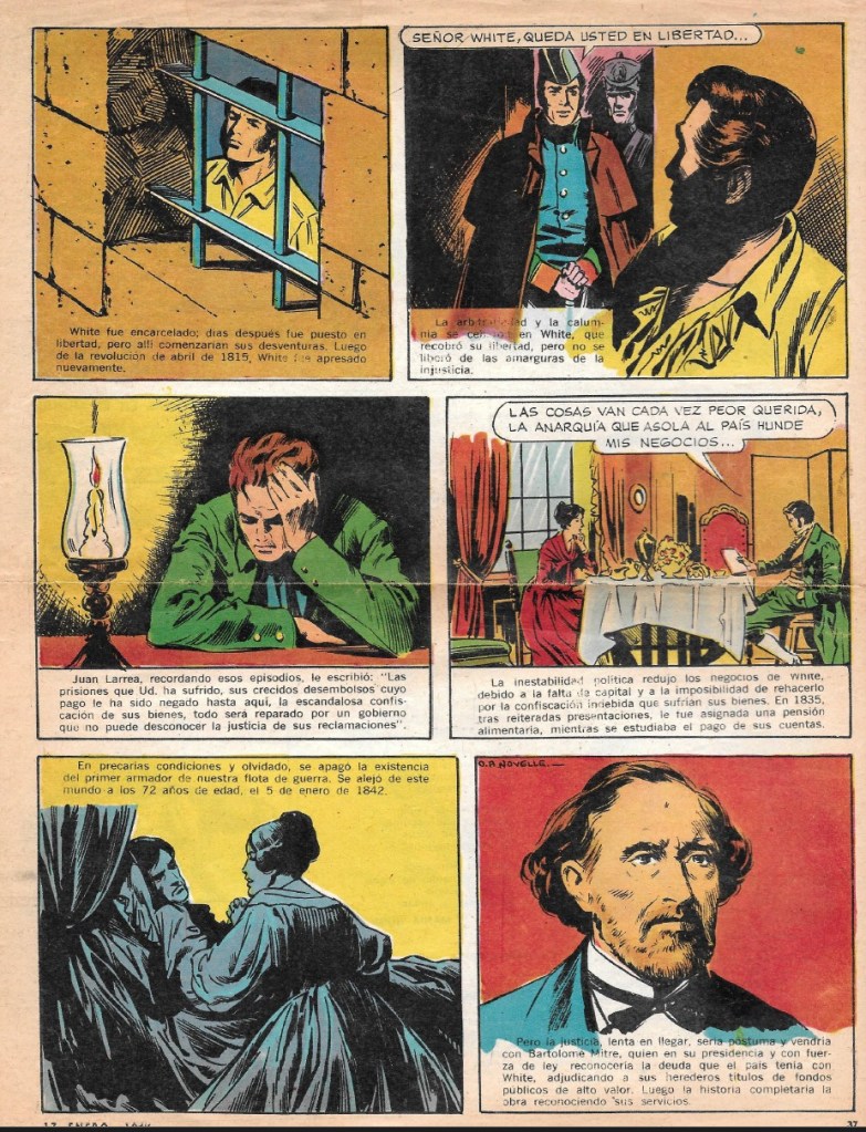 El relato es generalmente correcto, pero en el último cuadro de la tercera página suaviza lo que fue un violento encuentro entre White y el almirante Brown, cuando le cuestionó la demora en los pagos a oficiales y marineros (ver Un respetuoso pedido al almirante Brown.)