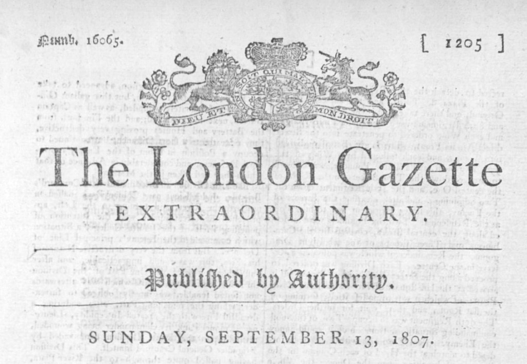 - The London Gazette – Extraordinary, Numb. 16065, Sunday, September 13, 1807, pp. 1205-1213