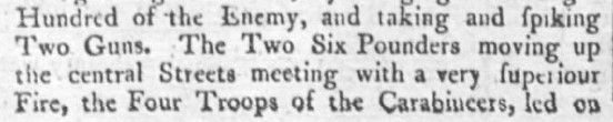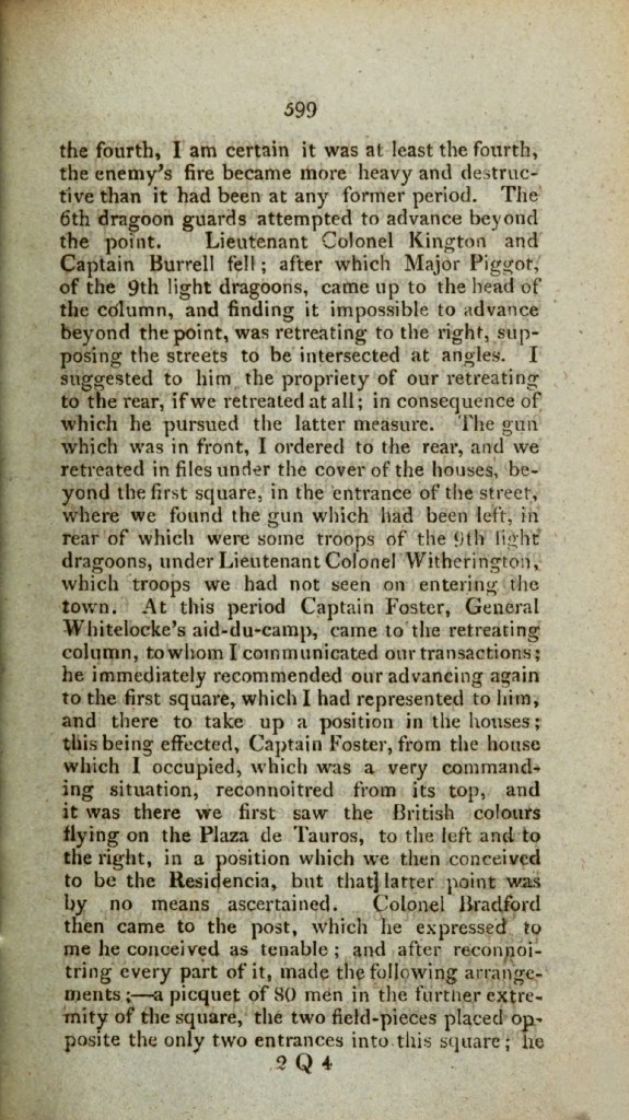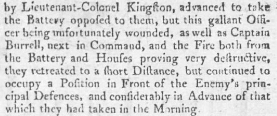 El 6º de dragones al mando del teniente coronel Kington avanzó con las otras columnas, pero desviándose, no llegó hasta las siete a la entrada de la ciudad, donde encontraron dos tropas del 9º de dragones ligeros con dos piezas de campaña. El coronel Kington los tomó bajo su dirección y durante algún tiempo avanzó sin la menor oposición. El enemigo abrió entonces el fuego contra la columna, y cuanto más avanzaba, más pesado y destructivo se volvía. Habiendo recibido el coronel Kington una grave herida en la pierna y muerto el capitán Burrell, sus hombres se vieron obligados a retirarse, dejando a su comandante en manos del enemigo.