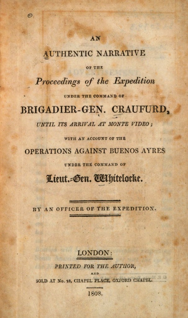 - _____, An authentic narrative of the proceedings of the Expedition under the command of Briadier-Gen. Craufurd, until its arrival at Monte video; with an account of the operations against Buenos Ayres under the command of Lieut.-Gen. Whitelocke, by an Officer of the Expedition, London, G. E. Miles, 1808