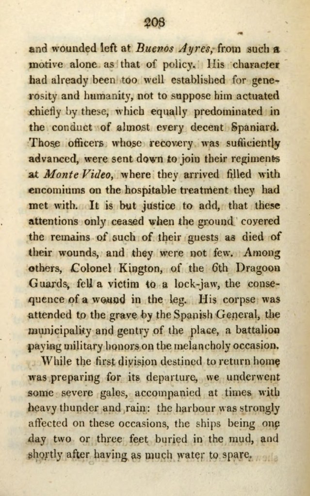 No sería justo deducir que las atenciones dirigidas por el general Liniers hacia los rehenes y heridos ingleses que permanecían en Buenos Ayres eran sólo motivadas por la política. Su carácter ya estaba demasiado bien establecido por su generosidad y humanidad, como para no suponer que se movía principalmente por éstas, que igualmente predominaban en la conducta de casi todo español decente. Aquellos oficiales cuya recuperación estaba suficientemente avanzada fueron enviados a unirse a sus regimientos en Monte Video, donde llegaron llenos de elogios por el trato hospitalario que habían recibido. Es justo añadir que estas atenciones sólo cesaron cuando el suelo cubrió los restos de sus huéspedes que murieron a causa de sus heridas, y no fueron pocos. Entre otros, el coronel Kington, de la 6ª Guardia de Dragones, fue víctima de tétanos, consecuencia de una herida en la pierna. Su cadáver fue atendido hasta la tumba por el general español, el municipio e hidalgos del lugar, un batallón rindiendo honores militares en la melancólica ocasión.
