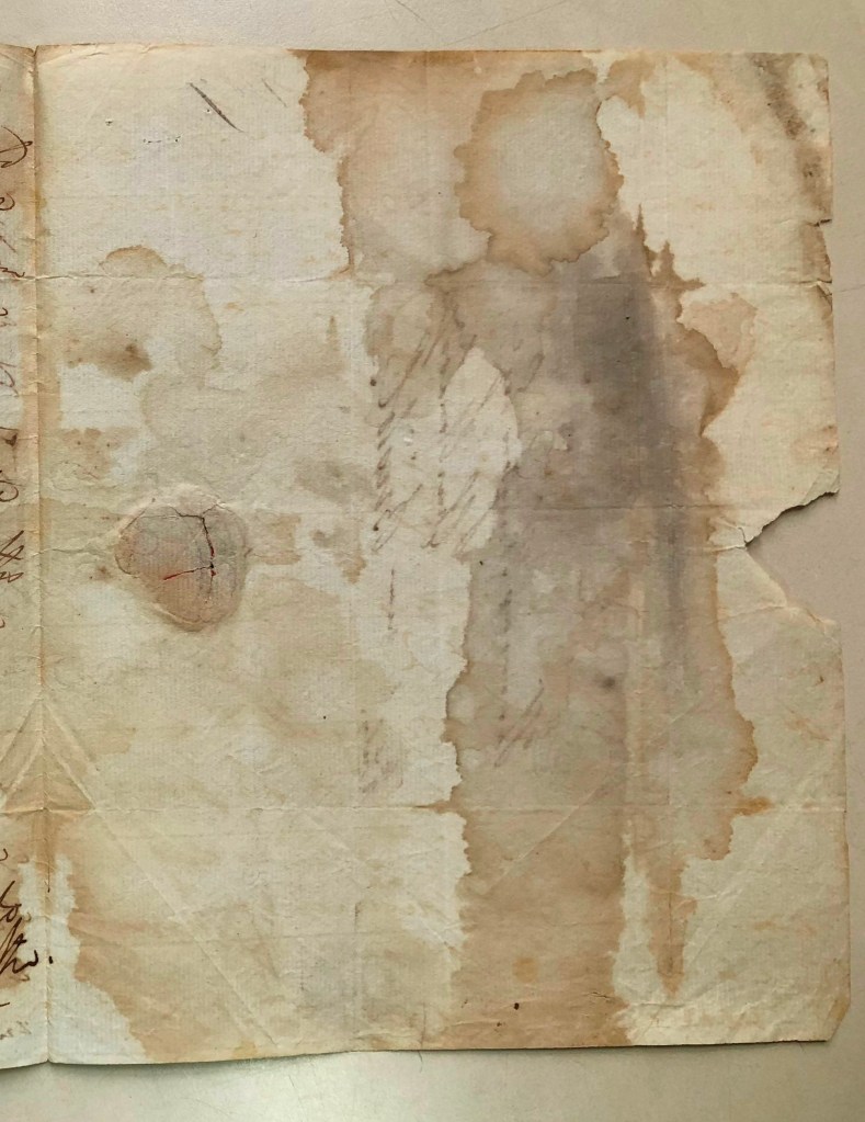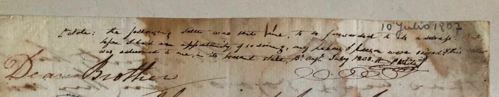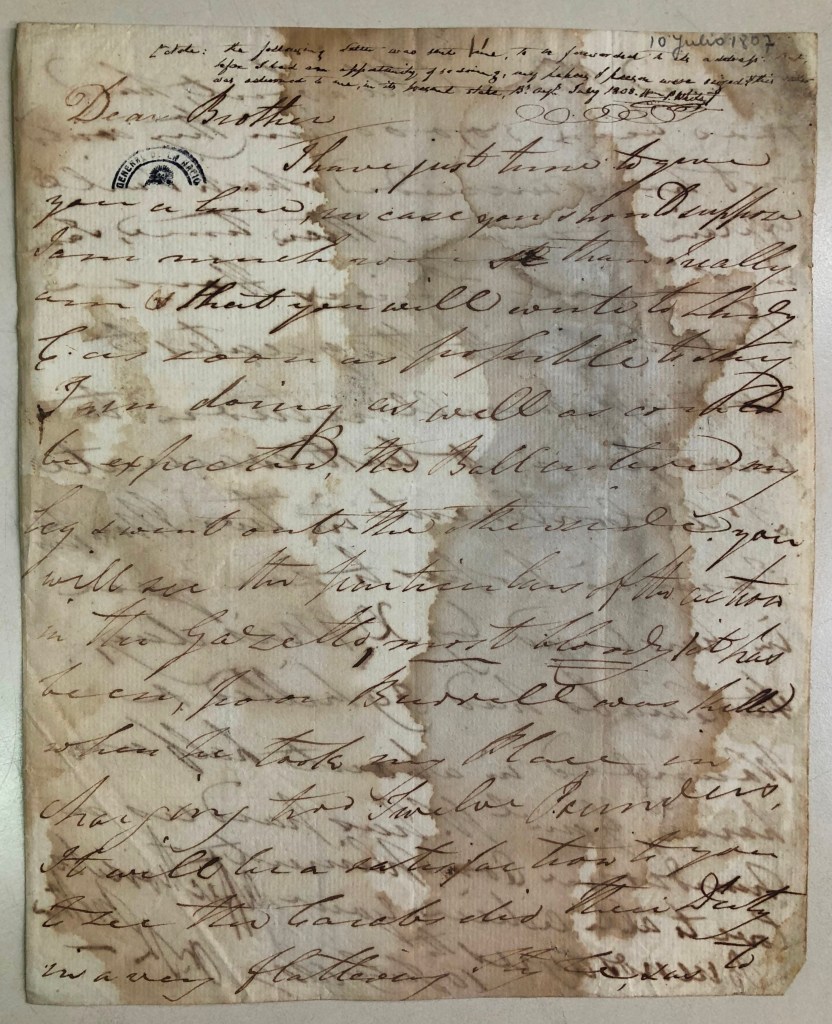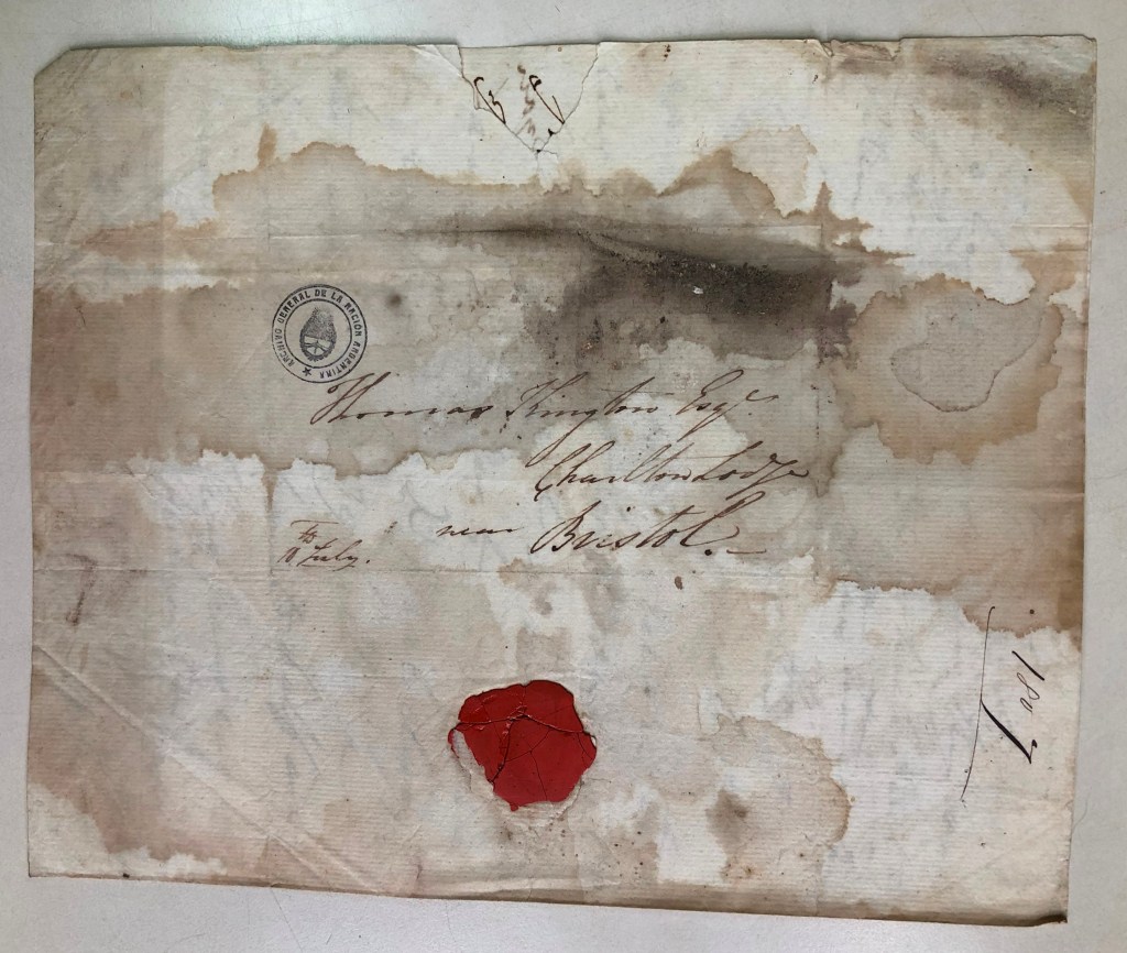 A la usanza de la época, una sola hoja de papel, adecuadamente plegada, servía de carta y sobre. Abierta y manchada de humedad, todavía mantiene el sello de lacre. Está dirigida a Thomas Kington, Esquire, de Charlton Lodge, cerca de Bristol (Somerset, Inglaterra), y fechada 10 de julio de 1807. La guardaba William P. White entre sus papeles, hoy conservados en el Archivo General de la Nación.
