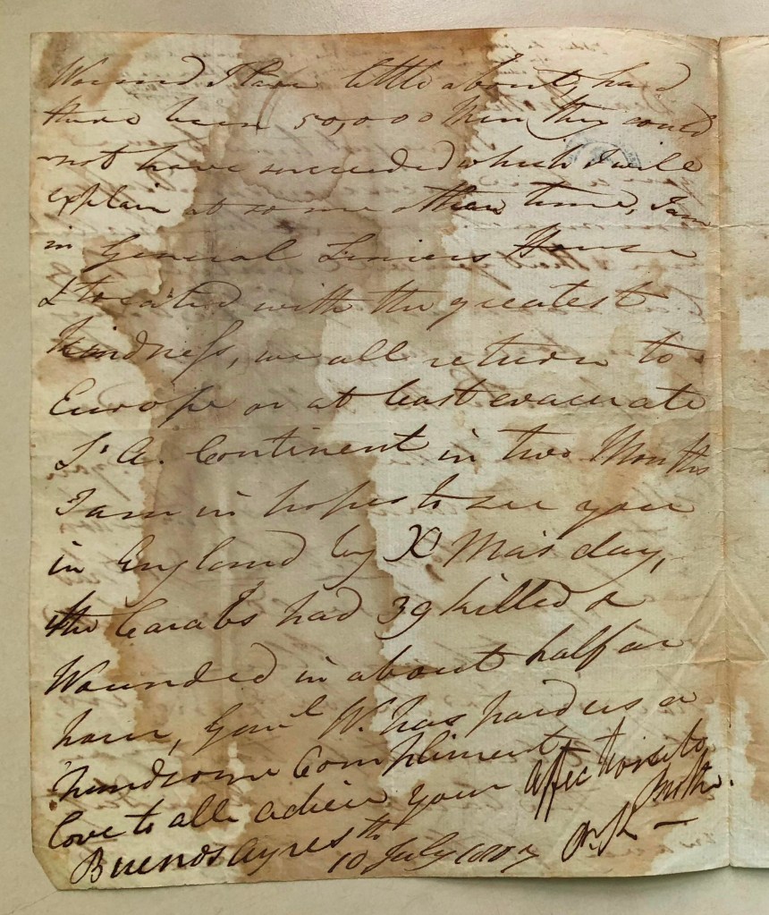 Wound I Care(?) little about, had there been 50,000 Men they could not have succeeded which I will explain at some other time, I am in General Liniers House & treated with the greatest kindness, we all return to Europe or at least evacuate S. A. Continent in two Months I am in hopes to see you in England by X’mas day, the Carabs had 39 killed & Wounded in about half an hour, Genl. W. has paid us a handsome compliment