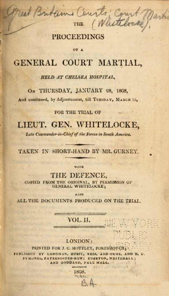 - The proceedings of a general court martial, held at Chelsea hospital, on Thursday, January 28, 1808, and continued, by adjournment, till Tuesday, March 15, for the trial of Lieut. Gen. Whitelocke, late commander-in-chief of the forces in South America – taken in shorthand by Mr. Gurney, London, printed for J. C. Mottley, Portsmouth, by Longman, Hurst, etc., 1808