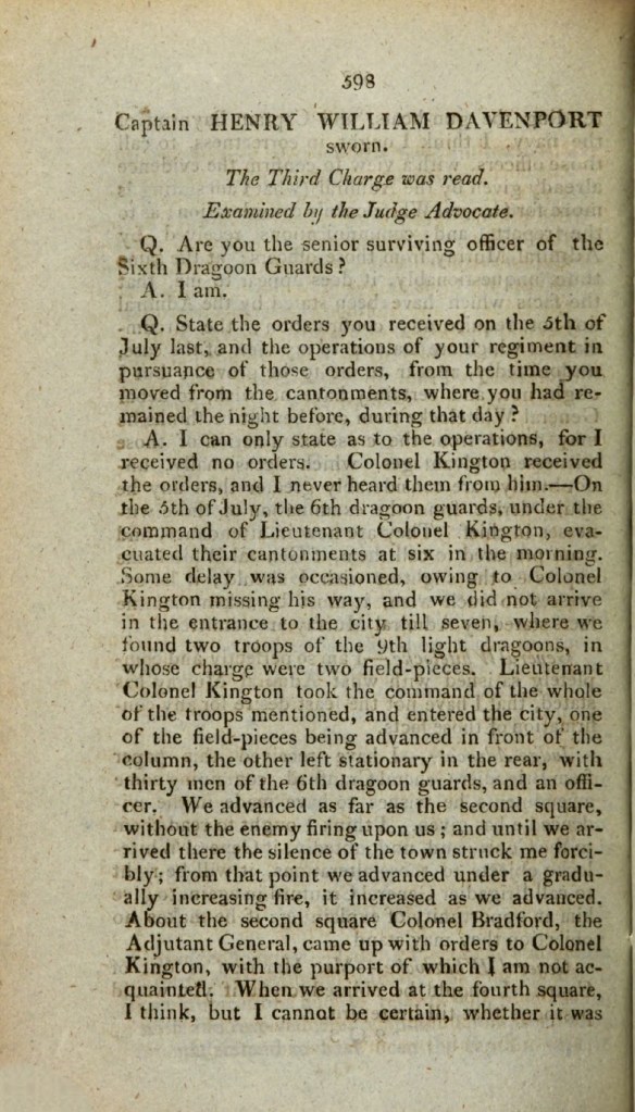 A. I can only state as to the operations, for I received no orders. Colonel Kington received the orders, and I never heard them from him.—On the 5th of July, the 6th dragoon guards, under the command of Lieutenant Colonel Kington, evacuated their cantonments at six in the morning. Some delay was occasioned, owing to Colonel Kington missing his way, and we did not arrive in the entrance to the city till seven, where we found two troops of the 9th light dragoons, in whose charge were two field-pieces. Lieutenant Colonel Kington took the command of the whole of the troops mentioned, and entered the city, one of the field-pieces being advanced in front of the column, the other left stationary in the rear, with thirty men of the 6th dragoon guards, and an officer. We advanced as far as the second square, without the enemy firing upon us; and until we arrived there the silence of the town struck me forcibly; from that point we advanced under a gradually increasing fire, it increased as we advanced. About the second square Colonel Bradford, the Adjutant General, came up with orders to Colonel Kington, with the purport of which I am not acquainted. When we arrived at the fourth square, I think, but I cannot be certain, whether it was the fourth, I am certain it was at least the fourth, the enemy’s fire became more heavy and destructive than it had been at any former period. The 6th dragoon guards attempted to advance beyond the point. Lieutenant Colonel Kington and Captain Burrell fell; after which Major Piggot, of the 9th light dragoons, came up to the head of the column, and finding it impossible to advance beyond the point, was retreating to the right, supposing the streets to be intersected at angles.