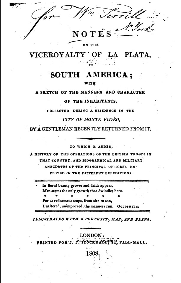 - _____, Notes on the Viceroyalty of La Plata, in South America: with a sketch of the manners and character of the inhabitants, collected during a residence in the city of Monte video, by a Gentleman recently returned from it, London, J. Stockdale, 1808