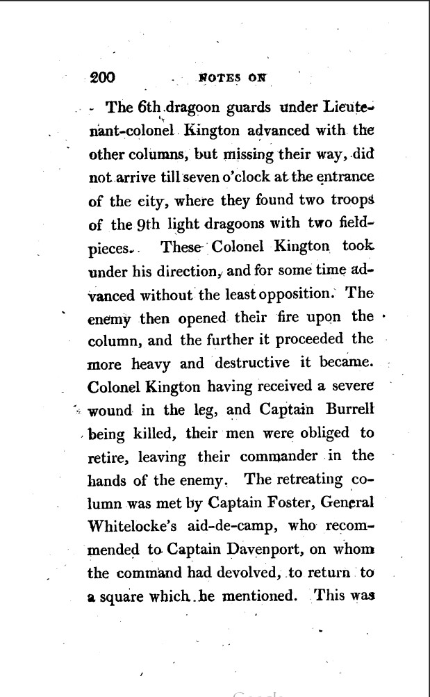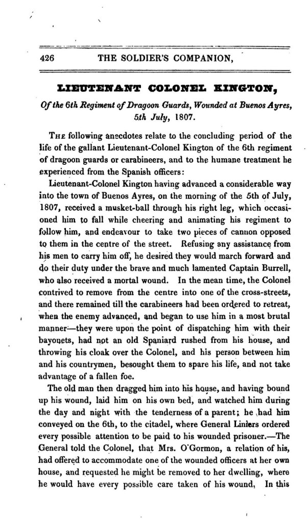 Habiendo avanzado el teniente coronel Kington una considerable distancia hacia la ciudad de Buenos Ayres, en la mañana del 5 de julio de 1807, recibió una bala de mosquete en la pierna derecha, que le hizo caer mientras vitoreaba y animaba a su regimiento a seguirlo y tratar de tomar dos piezas de cañón, frente a ellos en el centro de la calle. Rechazando cualquier ayuda de sus hombres para llevarlo, deseó que avanzaran y cumplieran con su deber bajo el mando del valiente y muy lamentado Capitán Burrell, quien también recibió una herida mortal. Mientras tanto, el coronel logró pasar del centro a una de las calles transversales, y allí permaneció hasta que se ordenó a los carabineros que se retiraran, cuando el enemigo avanzó y comenzó a tratarlo de la manera más brutal – estaban a punto de despacharlo con sus bayonetas, si un viejo español no hubiera salido corriendo de su casa y arrojando su capa sobre el coronel, y su persona entre él y sus compatriotas, les suplicó que le perdonaran la vida y no se aprovecharan de un enemigo caído.