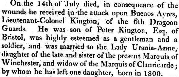 Kington había sido herido en el ataque al centro de la ciudad del 5 de julio. Tal como le dice a su hermano en la carta, The London Gazette, en una edición extraordinaria del 13 de septiembre de 1807, publicó un despacho del teniente general Whitelocke, dirigido a William Windham, Secretario de Estado (Guerra y Colonias).
