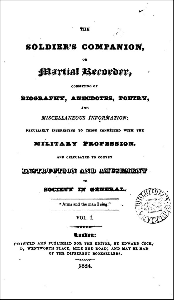 - _____, The soldier’s companion, or Martial recorder…, Vol. I, p. 426. London, Edward Cock, 1824
